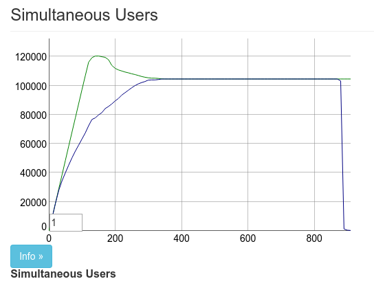 In the above image there are two lines on the chart, the line on the top is labeled “users” and the line on the bottom labeled “connected”. The users increases based on arrival rate. For most of these tests we used an arrival rate of 1000 users per second.